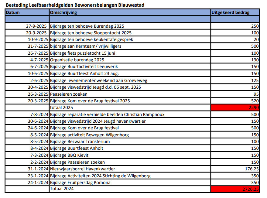 Bewonersbelangen Blauwestad ontvangt van de Gemeente Oldambt jaarlijks leefbaarheidsgelden die kunnen worden toegekend aan initiatieven ter verbetering van de leefbaarheid en sociale cohesie in Blauwestad.